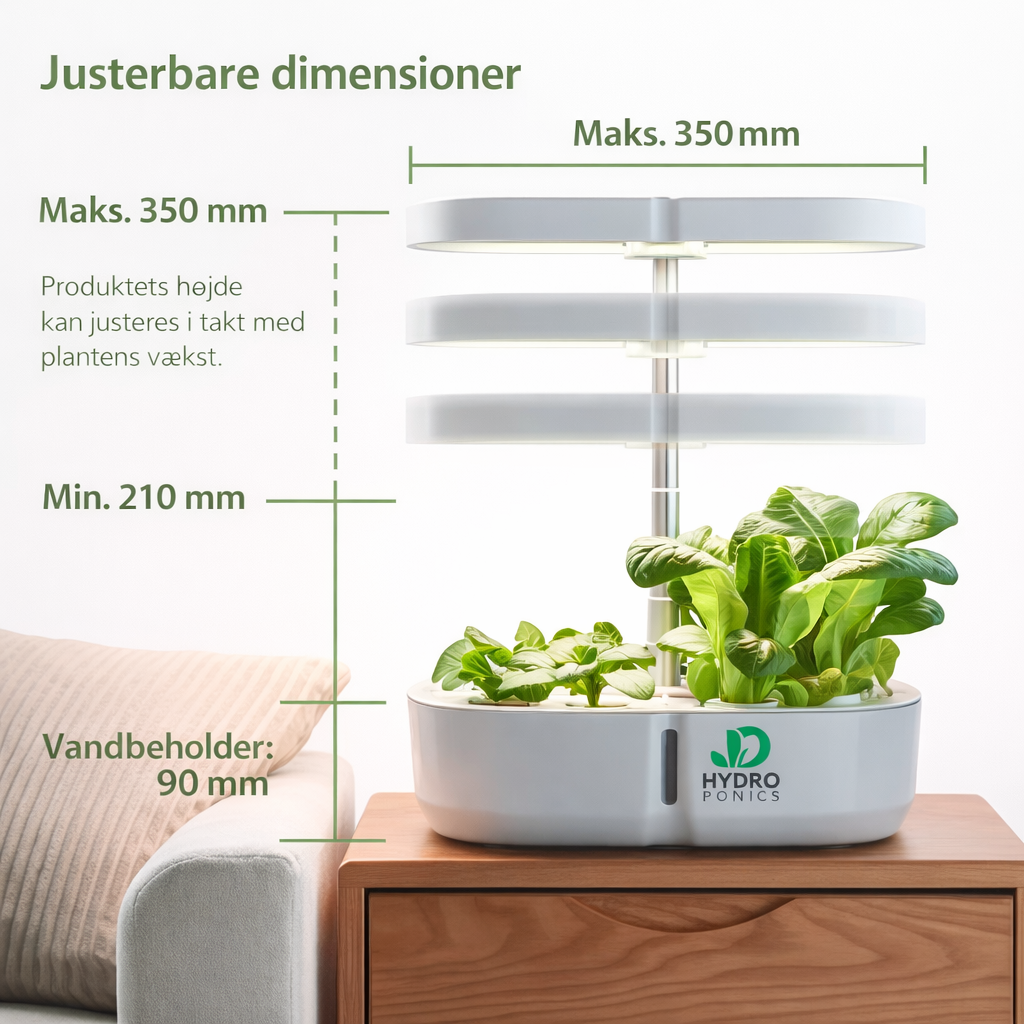 Det indbyggede LED-lys sikrer korrekt lysmængde hele dagen, mens vandbeholderen sørger for jævn og stabil vanding. Du skal blot fylde vand på – resten klarer Hydrokassen.
